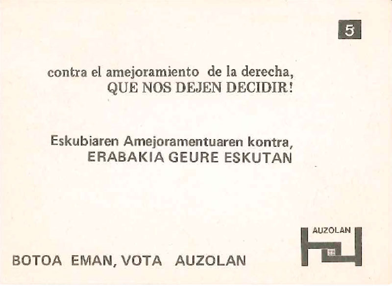 Algunas formaciones instruían a los candidatos sobre cómo afrontar las elecciones locales, mientras otras repartían pasaportes de verdaderos navarros. La pluralidad de Navarra llegó a Diputación (7 diputados de 4 formaciones) y al Parlamento. Este, negando su diversidad, definió una Navarra oficial para negociar y aprobar sin referendum el Amejoramiento, estatuto de una Navarra diferente de todos, pero sobre todo de Euskadi.