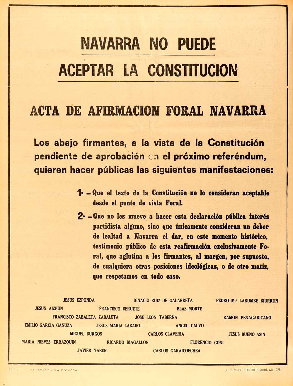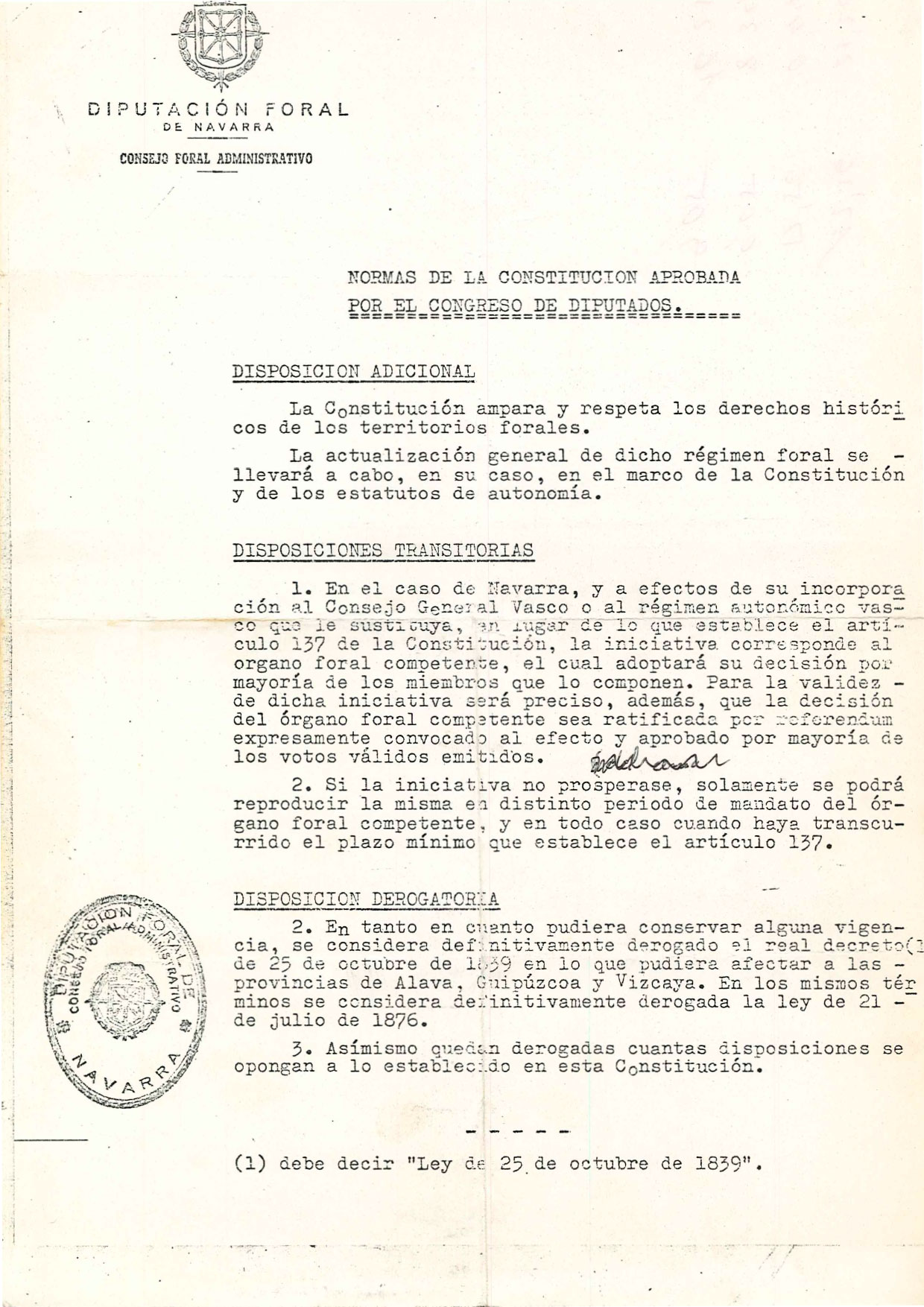 La Constitución de 1978 aprobó el marco de derechos y deberes de toda la ciudadanía española. Sin embargo, el debate constitucional tuvo una especial lectura desde Navarra. Frente al foralismo tradicionalista de la Diputación encabezada por Amadeo Marco, que proponía la no afección de la Carta Magna al antiguo reino y el avance hacia la reintegración foral plena, surgió un foralismo reformista que quiso hacer compatibles Fueros y Constitución. La Disposición Adicional Primera y la Derogatoria Segunda (sin efectos para Navarra) abrieron una original vía navarra a la autonomía a partir de la actualización de su régimen foral en el marco de la Constitución.