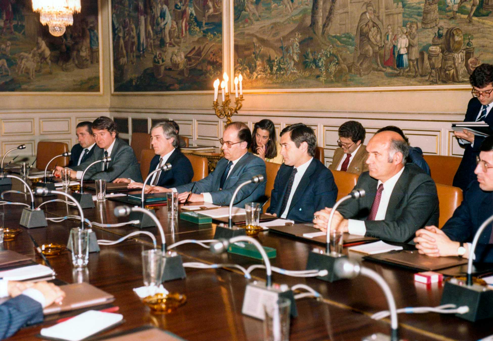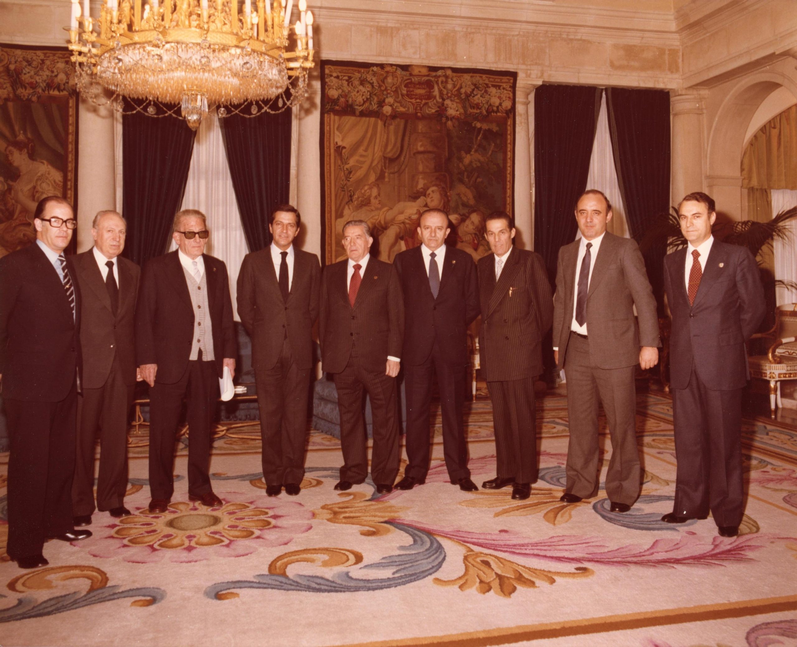 Firma del acuerdo entre el Gobierno de la Nación y la Diputación Foral y Provincial de Navarra sobre elecciones locales y democratización de instituciones forales en el palacio de la Moncloa de Madrid. De izquierda a derecha, Juan Manuel Arza Muñuzuri, Julio Iturralde Agorreta, Amadeo Marco Ilincheta, Adolfo Suárez González, Julio Asiáin Gurucharri, Jesús Fortún Ardaiz, Félix Visus Antoñanzas, Ignacio Irazoqui Aranibar y Joaquín Gortari Unanua, secretario de la Diputación.