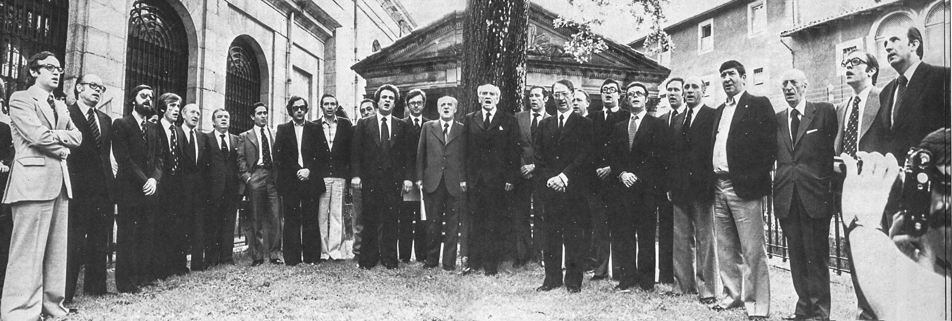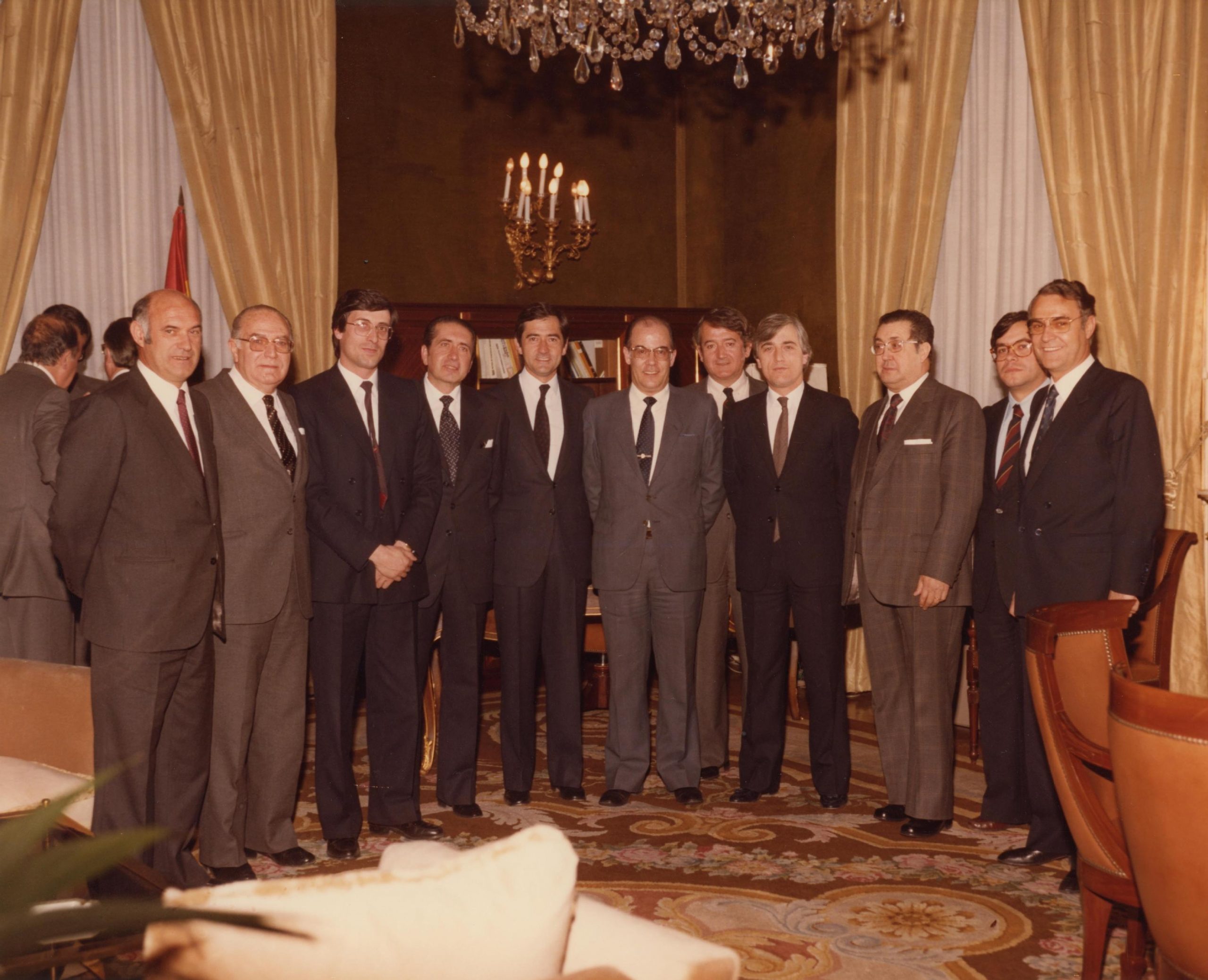 Comisión negociadora de Navarra del Amejoramiento del Régimen Foral en Madrid. De izquierda a derecha, Jesús Malón Nicolao, diputado foral, José Ángel Zubiaur Alegre, asesor, Pedro Sánchez de Muniáin Corera, diputado foral, Jesús Aizpún Tuero, diputado nacional, Ángel Lasunción Goñi, diputado foral, José Manuel Arza Muñuzuri, presidente de la Diputación, Javier Moscoso de Prado Muñiz, diputado nacional, Gabriel Urralburu Tainta, diputado nacional, Raimundo Aldea Eguílaz, asesor, José Antonio Asiáin Ayala, asesor, y Joaquín Gortari Unanua, secretario de la Diputación.