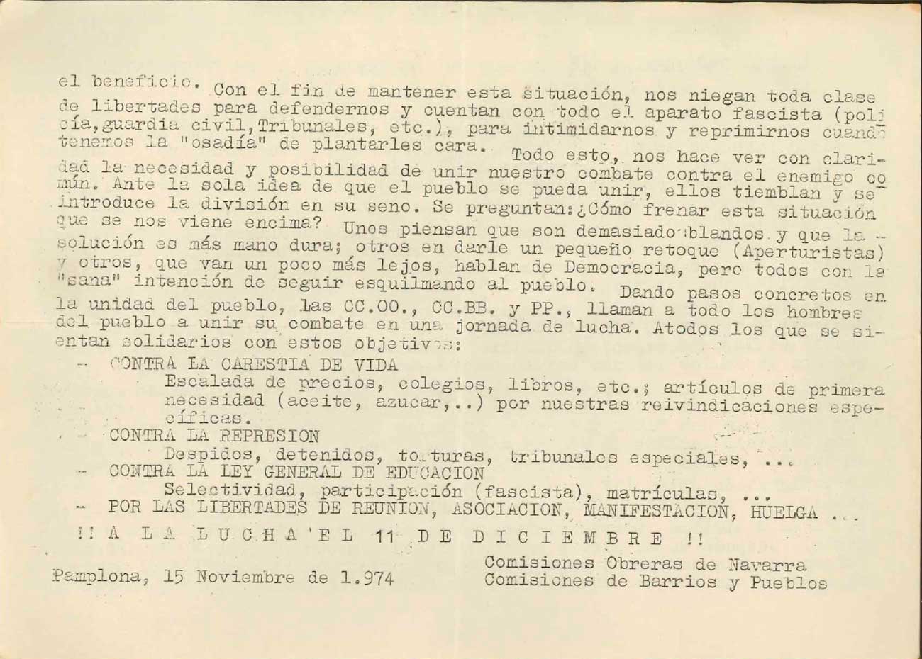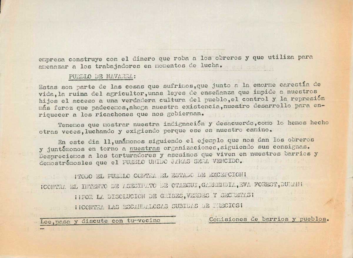 La muerte de Franco en 1975 abre simbólicamente el inicio de la Transición. No obstante, las ansias de la sociedad por poner fin a la dictadura comenzaron más de una década antes. El anhelo de profundos cambios caló en la vida cotidiana de una ciudadanía que empezó a movilizarse para reivindicar derechos políticos, laborales, lingüísticos o una mejora de las infraestructuras de barrios. La liberalización económica del régimen y la nueva fase de industrialización en Navarra trajeron consigo la creación de una joven clase obrera y un tejido asociativo antifranquista radicalizado desde las influencias del 68 francés, con formas de organización asamblearias. Progresivamente más quirúrgica, aunque igualmente inhumana, la represión franquista se dirigió contra estas señales de transformación incluso después del fallecimiento del dictador, marcando el rumbo de una Transición que conjugaba el anhelo ciudadano de libertad junto a las inercias del régimen y su resistencia a desaparecer.