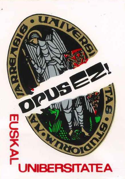 Protesta contra la Universidad de Navarra y en favor del Distrito Universitario Vasco. Segunda mitad de los años 70. Pegatina. Euskal Unibersitatea. Opus ez! = [Universidad vasca. ¡Opus no!].