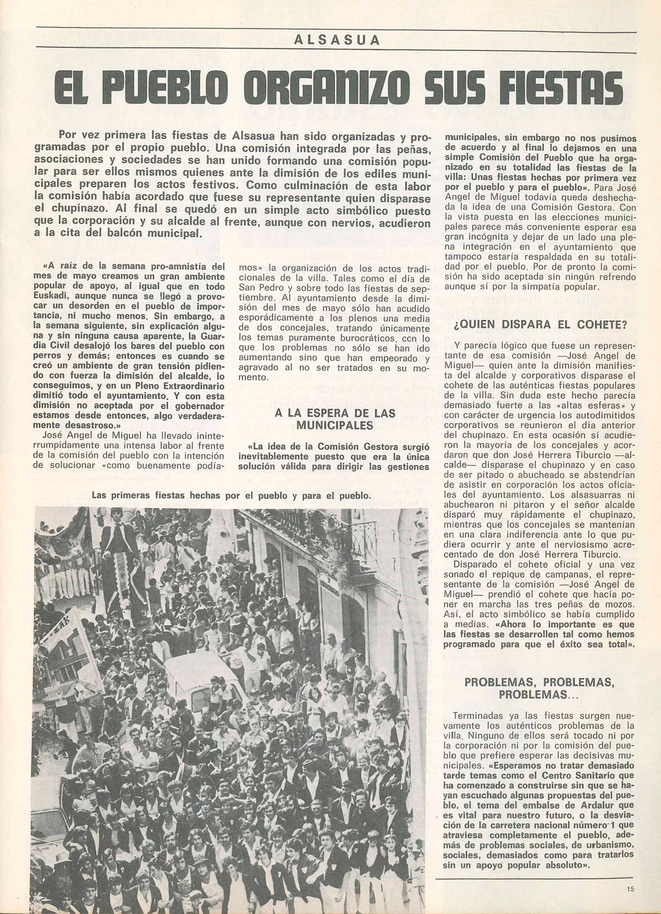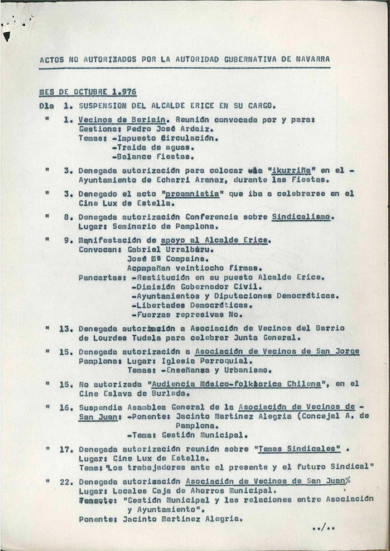 En 1972, la organización de los Encuentros de Pamplona como certamen cultural y artístico de vanguardia fue criticada por la oposición debido a su vinculación al grupo empresarial Huarte. La actividad política se extendió desde las fábricas y llegó a pueblos y barrios. Las marchas pro-amnistía, las huelgas anti-represivas o la autoorganización asamblearia asentaron un nuevo tejido participativo y popular que fue capaz de organizar nuevos modelos de ocio.